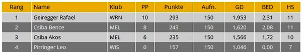 Vorrunde 4. Klasse Freie Partie am 25. - 31.08.2025 in Bruck/L 0,000 - 3,000 60 Punkte 25 Aufnahmen |