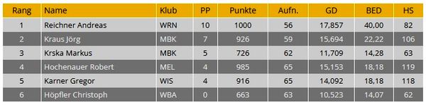 | 2. | Kreuzthaler Thomas | BCB | 6 | 243 | 80 | 3,037 | 3,75 | 22 |