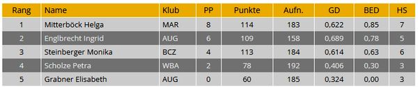 | 1. | Bäcker Klaus | BRU | 6 | 88 | 189 | 0,465 | 0,63 | 5 |